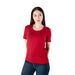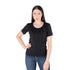 Apresente esta t-shirt como um básico de luxo, destacando o algodão egípcio como símbolo de qualidade superior aliado ao conforto do elastano. Reforce sua versatilidade e durabilidade, posicionando-a como investimento certeiro para um guarda-roupa feminino premium e atemporal.